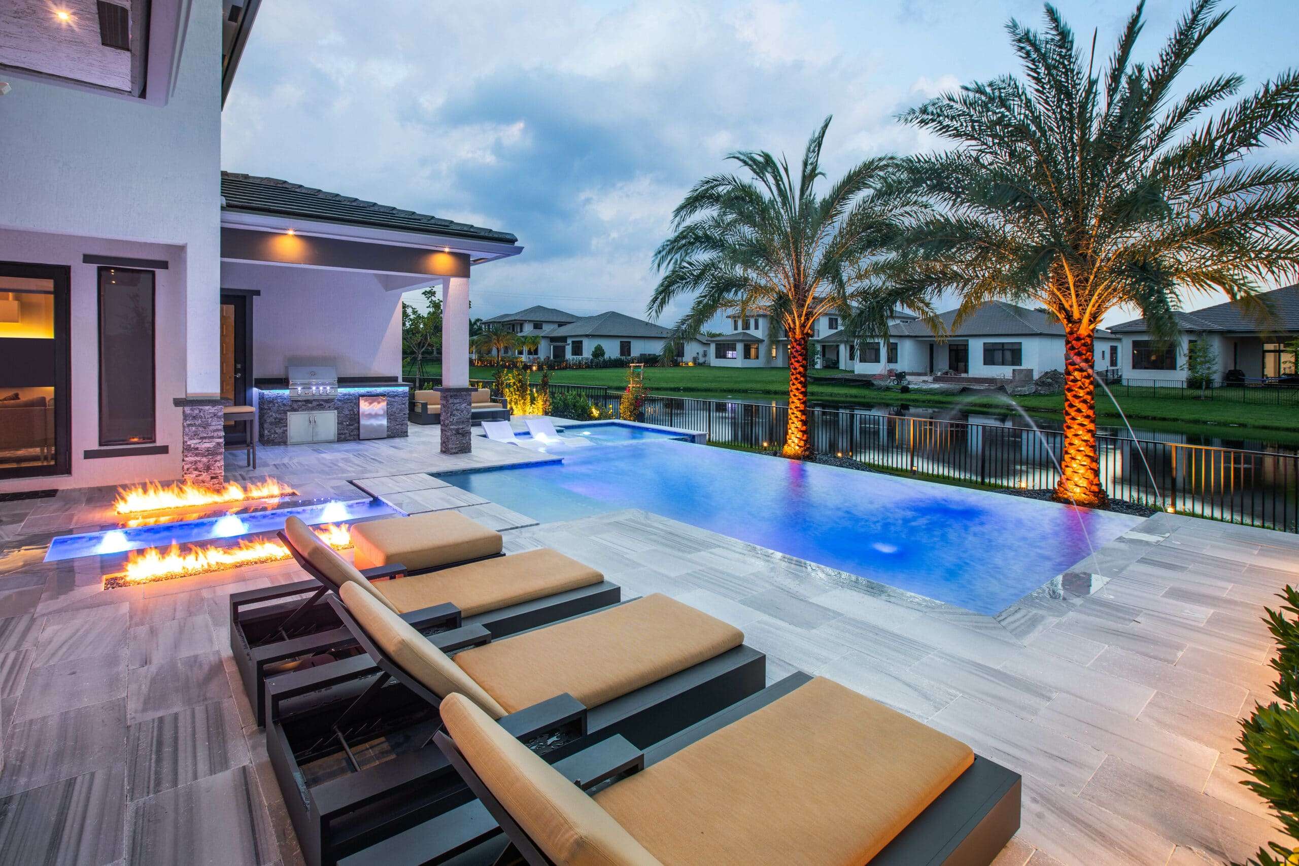 Luxury evening patio design showcasing custom landscape lighting, synthetic turf grid, and a modern water feature.